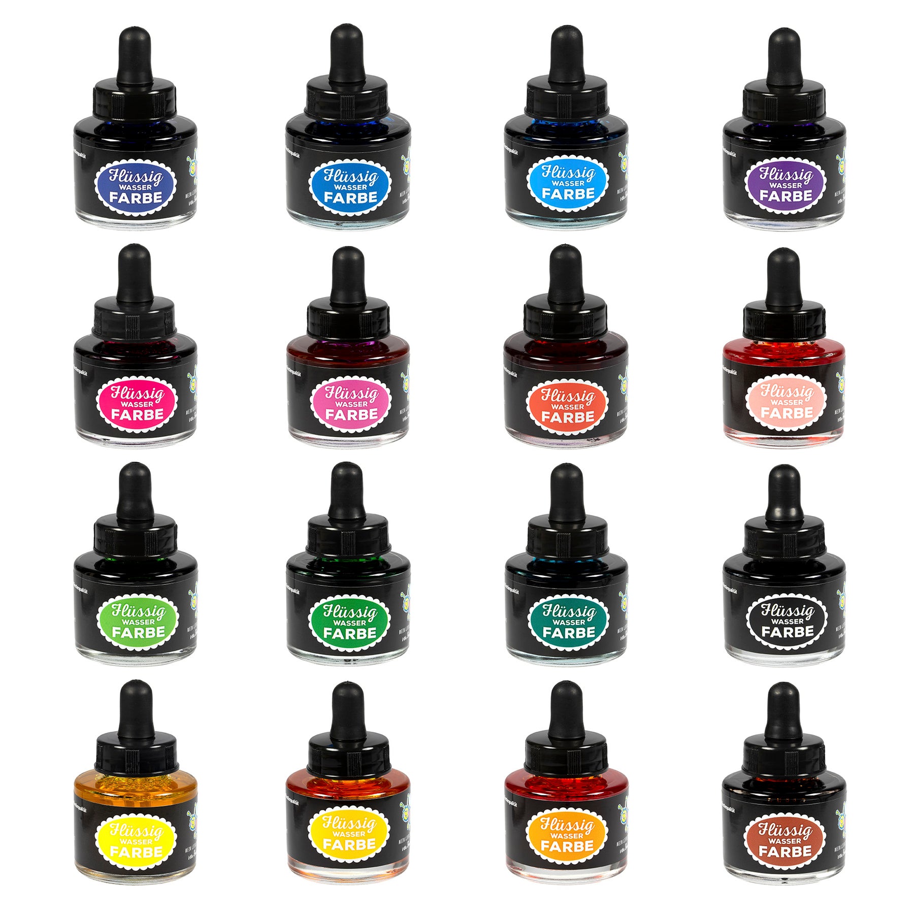 Dieses Set enthält 16 verschiedene Farben aus unserem Flüssigwasserfarben-Sortiment: