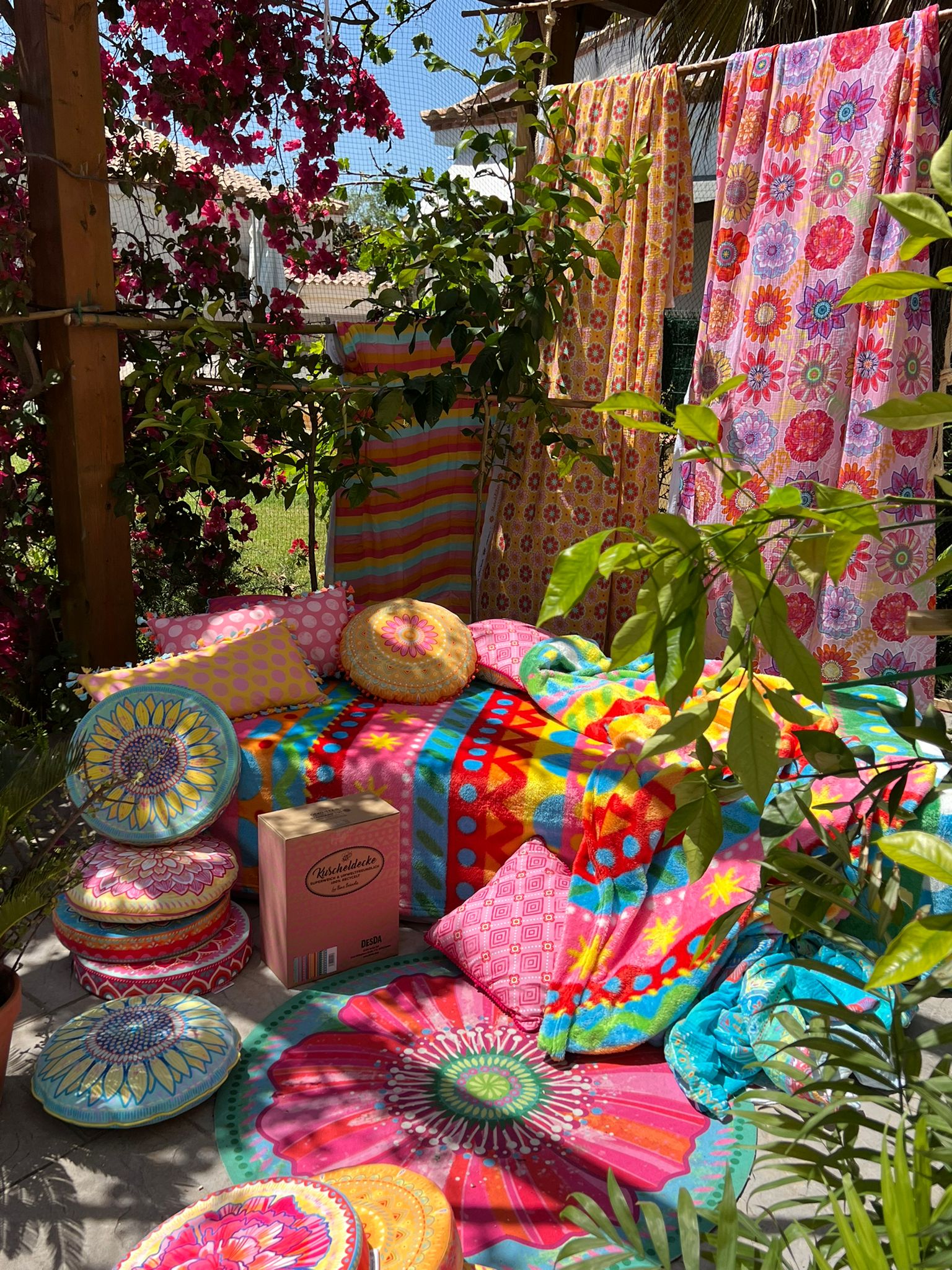 Natürlich kannst du die pflegeleichte Decke auch mit nach draußen nehmen. Übrigens ist die Decke komplett durchgefärbt, also auf beiden Seiten gleich bunt.